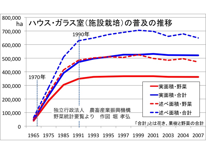 「夏野菜が冬でも出回るようになった。」「どの野菜の旬が、いつだったかわからなくなった。」などの声をよく聞きます。実感として感じるだけでなく、図1が示す通り、ビニルハウスやガラス室などを用いた施設栽培による農作物生産が増えています(花きを含む)。ただし、1990年以降は、ほほ横ばいになり、増えていないことにも注目してください。