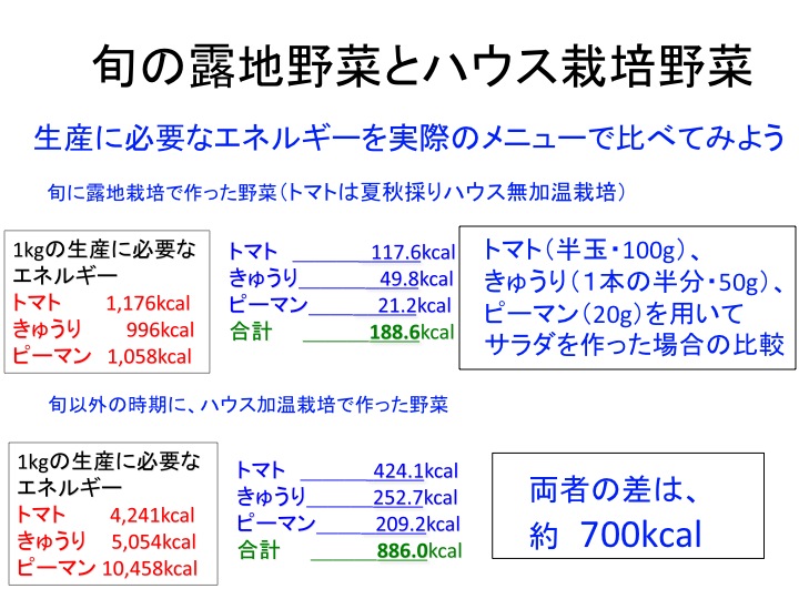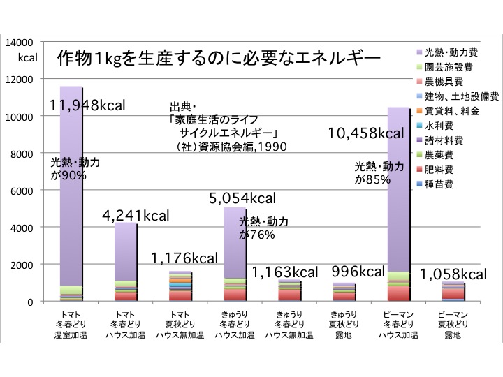 旬に露地栽培された野菜と比べて、旬以外の季節にハウス等を用いて加温栽培された野菜の生産には、数倍から10倍近いエネルギーが追加的に必要であることかわかります。