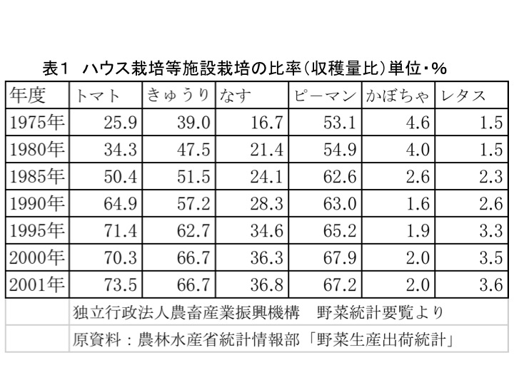 ・ハウス栽培やガラス温室などの施設栽培の比率が高いのは、トマト、きゅうり、なす、ピーマンなど限られた作物。これらは通年供給されるようになった後、消費が減っている。