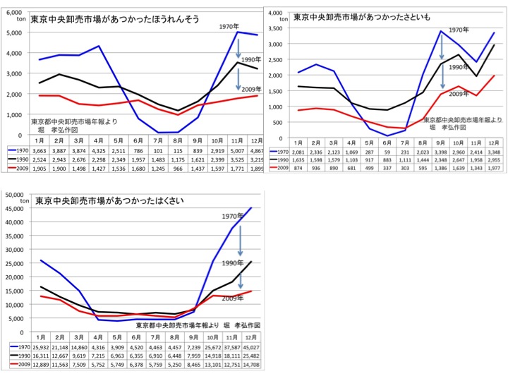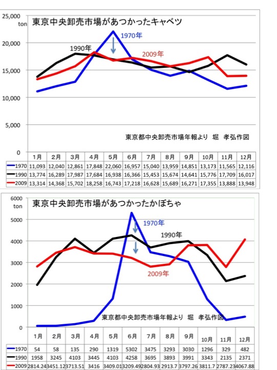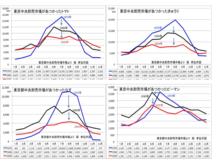 直近の2009年の他、1970年と1990年を取り上げたのは、ほぼ20年間隔であり変化が見やすいこともありますが、1970年は施設栽培の普及が本格化し始めた時期で、それぞれの野菜の本来の旬がまだ残っていると思われること、1990年は図1で示したように、施設栽培が普及しきったとみなすことができる時期であること、このような理由からです。