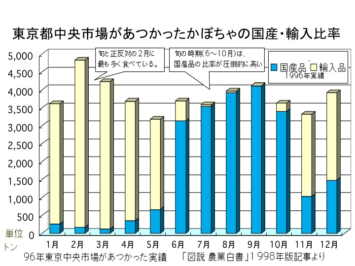 かぼちゃについて、ひとつ注目してもらいたいのは、本来の旬である夏はほぼ国産でまかなわれていますが、旬と反対の2月や3月の利用の方が多くなっています。当然ほとんど輸入に頼っています。「何の旬がいつだったか」そのような情報も、立派に環境情報になります。