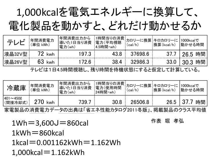図4 1,000kcalを電気エネルギーに換算し、電化製品を動かすと、どれだけ動かすことができるか