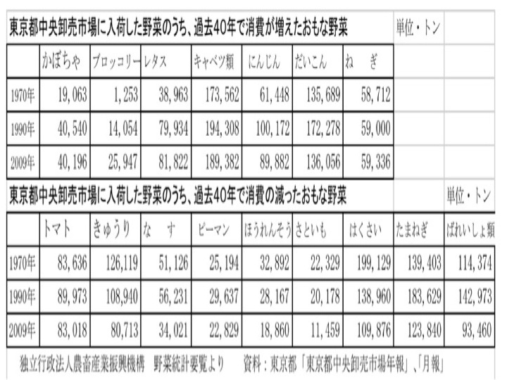 1970年以降の40年間、野菜の消費にはどのような変化があったのでしょう。表2は、東京都中央卸売市場に入荷した野菜のうち、独立行政法人農畜産業振興機構の『野菜統計要覧』V-2「東京都中央卸売市場の月別入荷量の推移」が取り上げている16種の野菜の年間入荷量です。このなかには、小売店に卸され、消費者が店頭で購入する生鮮野菜の他、飲食店に卸され外食の材料となるもの、また、外国産の野菜も含まれています。そのうち1970年、1990年、2009年のデータを抜き出しました。