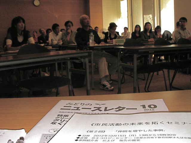 市民活動を実践している人から、「新たな仲間が得られず、活動メンバーが固定・高齢化している」という声をよく聞きます。市民活動の未来を拓くセミナー第2回のテーマは、「仲間を増やした事例」。2012年10月15日(月)、13時から16時30分まで京エコロジーセンター(京都市伏見区藤森)で開催しました。