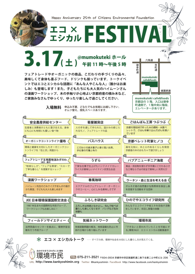 フェアトレードやオーガニックの商品、こだわりの手づくりの品々、美味しくて身体も喜ぶフード、ドリンクも揃っています。トークイベントではエコとエシカルな話題に「あんな人やこんな人」(誰かはお楽しみ)も登場します!また、子どもたちにも大人気のハイムーンさんの漫画ワークショップ、木の手触りが心地よい京都府産の積み木など、ご家族みなさんでゆっくり、ゆったり楽しんで過ごしてください。