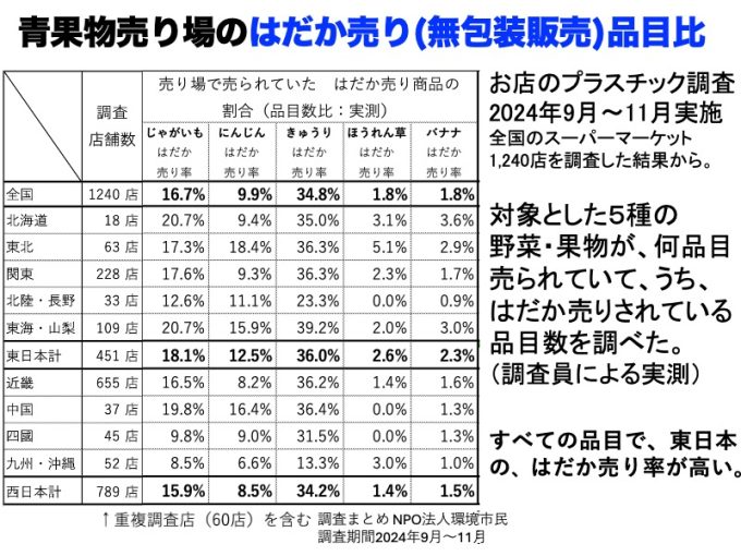 5種の野菜・果物(じゃがいも、にんじん、きゅうり、ほうれん草、バナナ)の店頭商品数とはだか売り商品の比率でも、全ての品目で東日本の方が、西日本よりはだか売り率が高いことがわかり、「プラ包装の西高東低」の傾向が明らかになりました。
