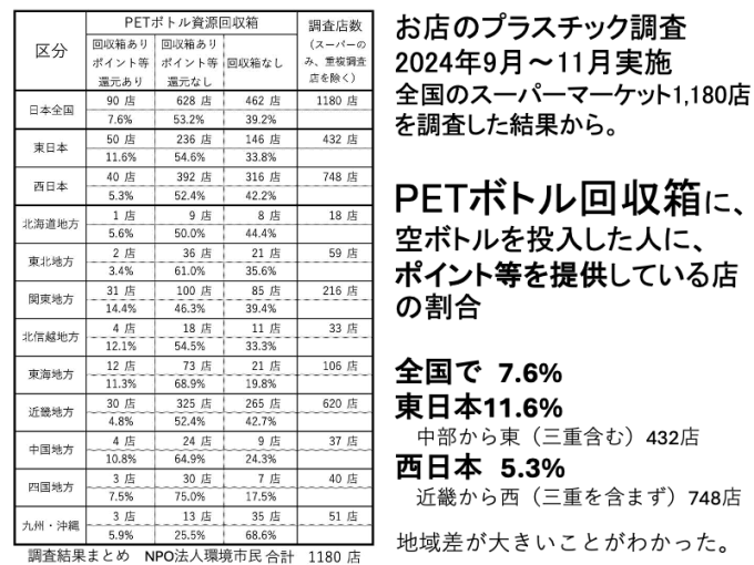 | 区分 | PETボトル資源回収箱 | 調査店数 (スーパーのみ、重複調査店を除く) | ||