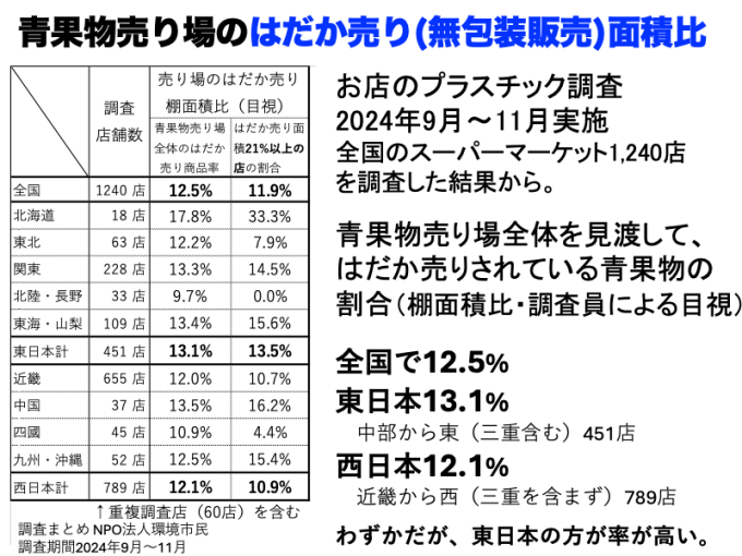 2024年の調査で、日本のスーパーマーケット等店頭の青果物のはだか売り(無包装販売)率は10%台前半で、90%近くがプラ包装されていることを明らかにしました。