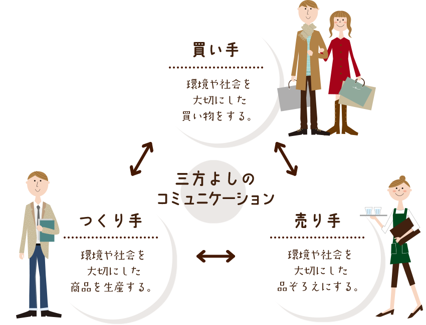 私たちは、持続可能な社会づくりの身近な入り口として、買い物に着目しました。 買い物は社会を変える投票です。 環境や社会を大切にした消費者が増えれば、その生活が変わり、 お店の品揃え、商品の生産も変わっていく。 そう考え、私たちは活動してきました。