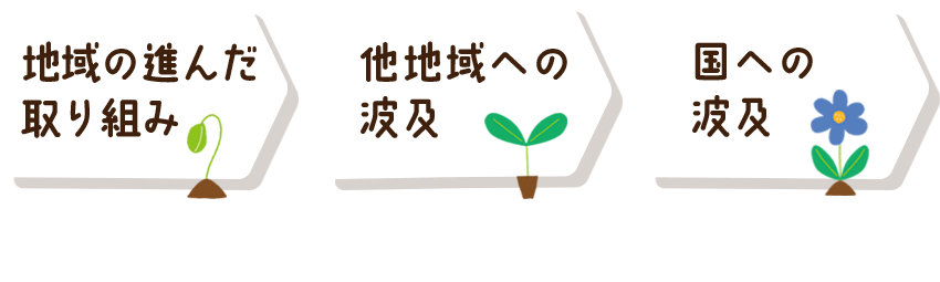 持続可能で豊かな社会・生活を実現する。 そのためには、社会の仕組みが変わることが大切です。 これまで社会を変えてきた多くの仕組みは、まず小さな地域のチャレンジとして始まり、 それが、他の地域へと広まり、国の制度が変わるというプロセスをたどってきました。
